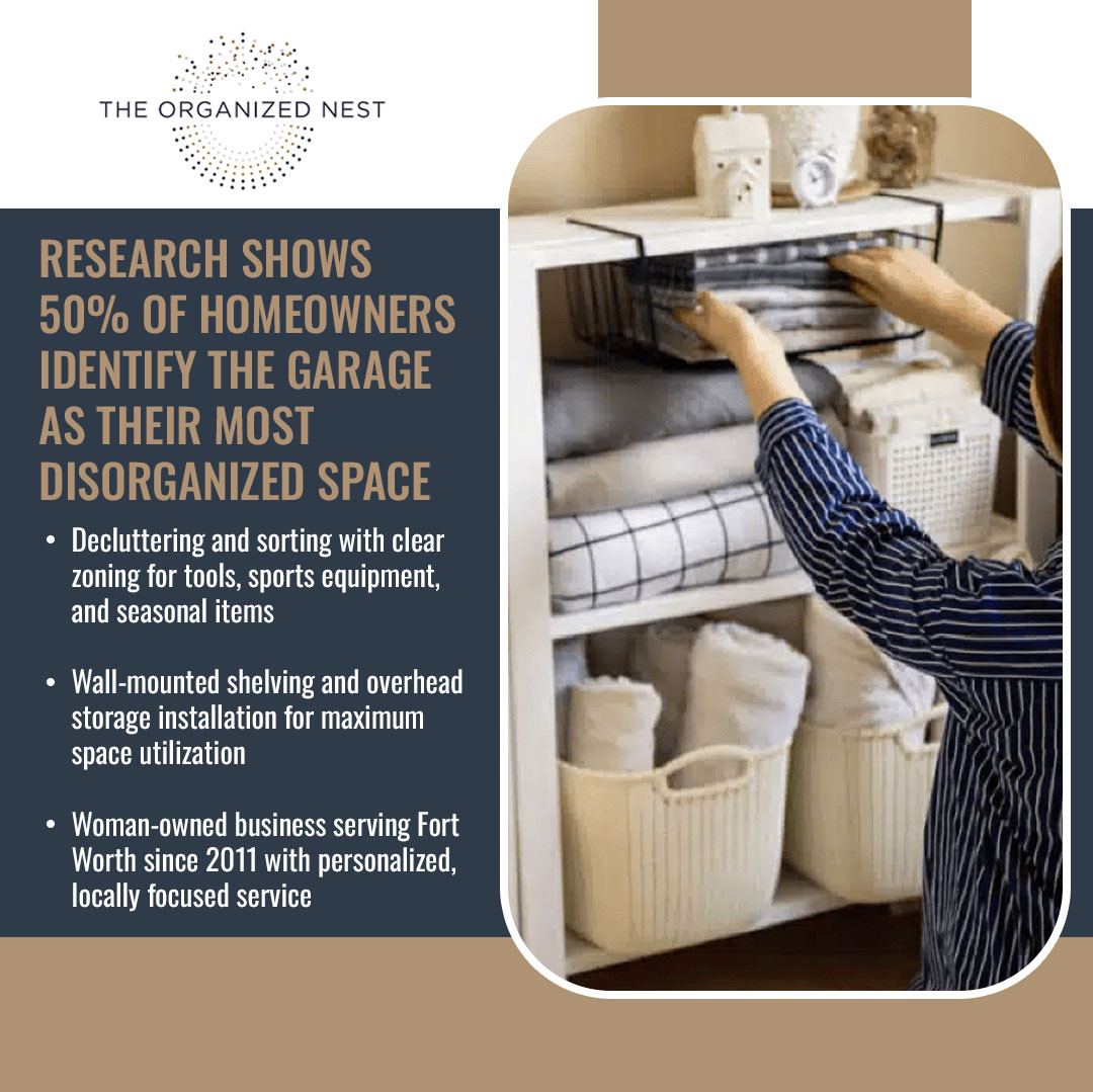Research by industry experts shows that 50% of homeowners identify the garage as the most disorganized area of the home. The Organized Nest addresses this challenge by delivering structured, practical garage systems for families throughout the Fort Worth area.
