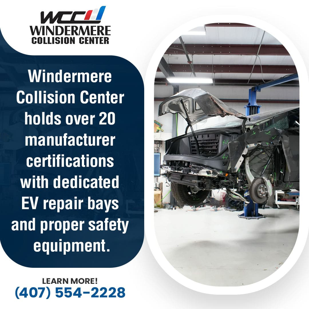 Windermere Collision Center maintains over 20 manufacturer certifications, including Tesla Approved Collision Center status, with dedicated EV repair bays and specialized equipment required for safe electric vehicle service.